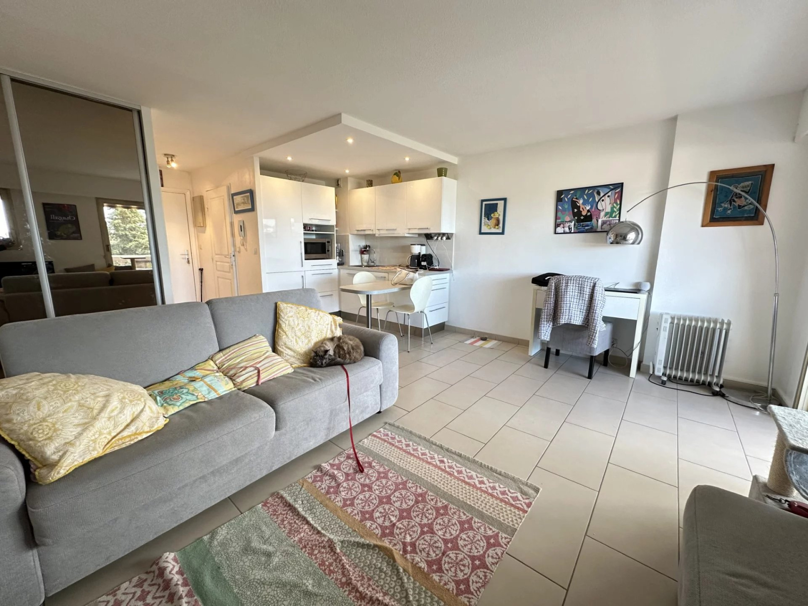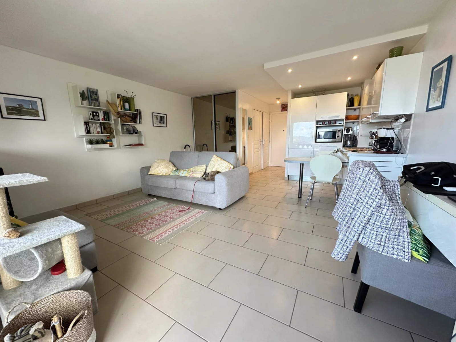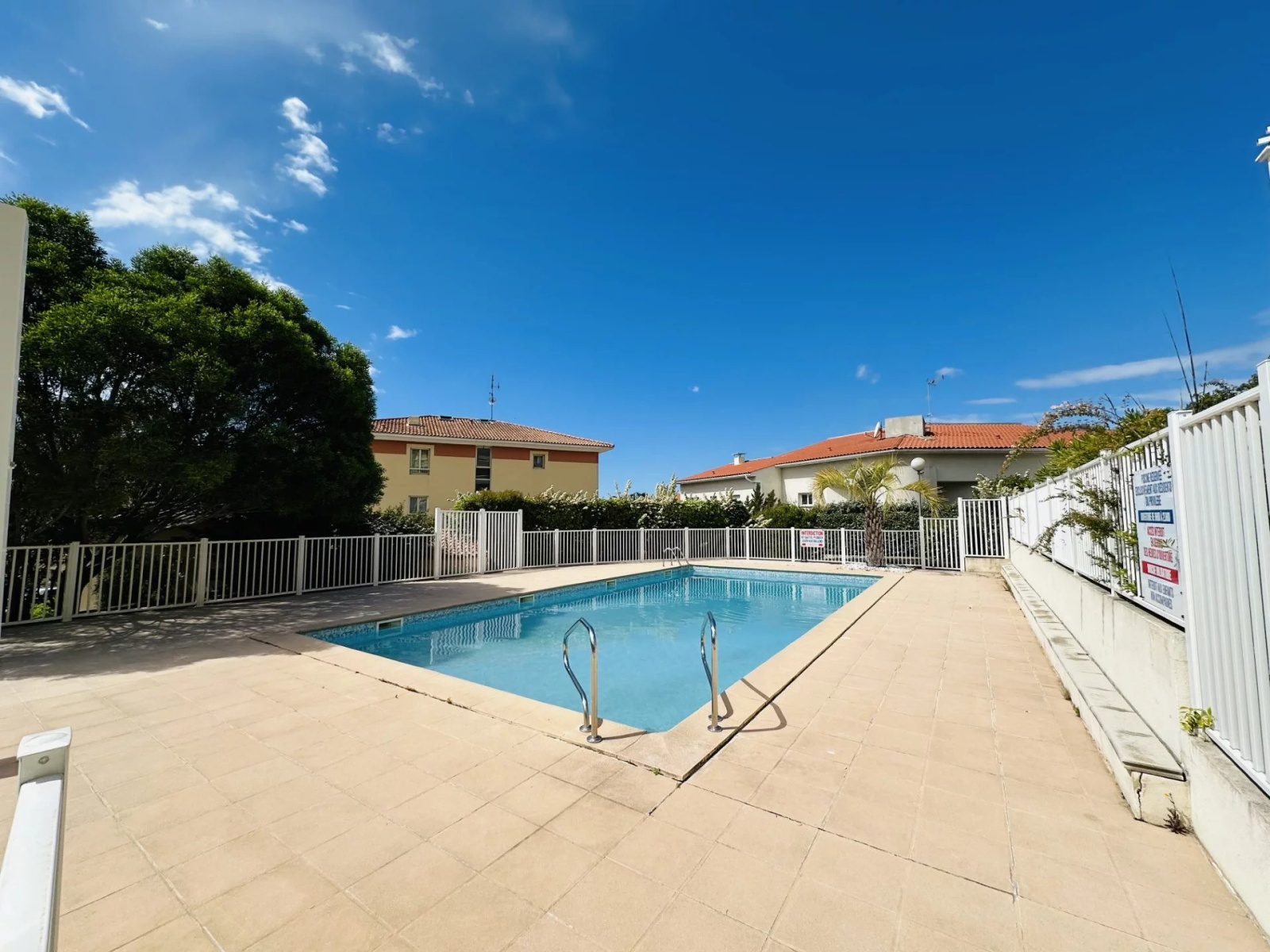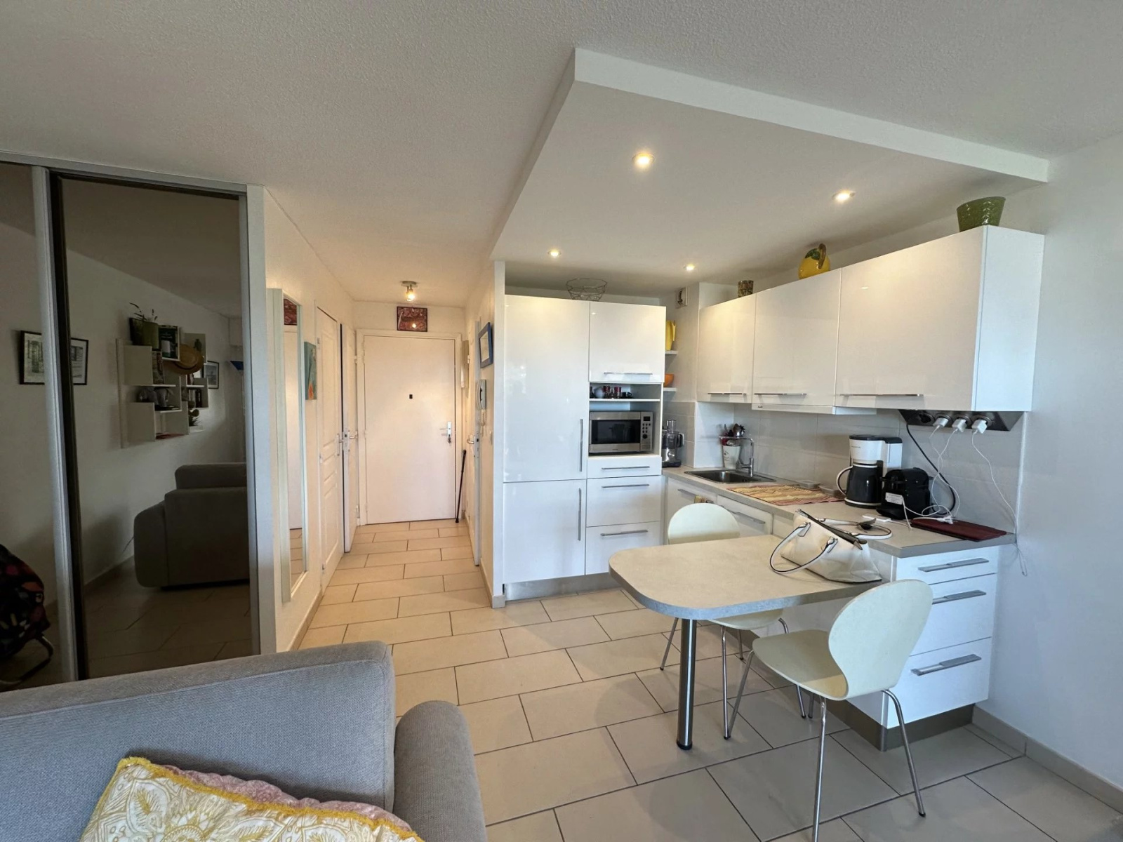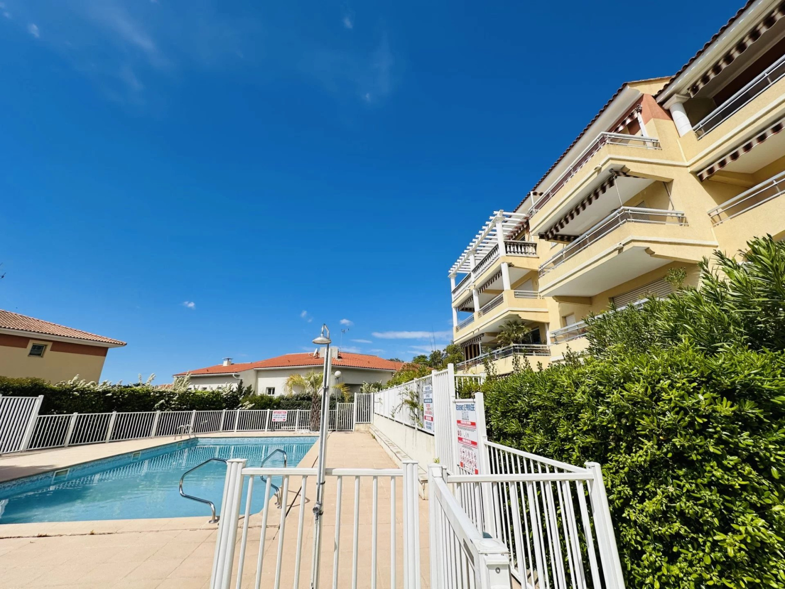 Au sein d'une résidence avec piscine, studio de 31.76 m² bénéficiant d'une terrasse de 9 m² au sud face à la mer, d'une pièce de vie avec cuisine et placard, d'un wc, d'une buanderie et d'une salle de douche. Un garage est inclus dans le prix.