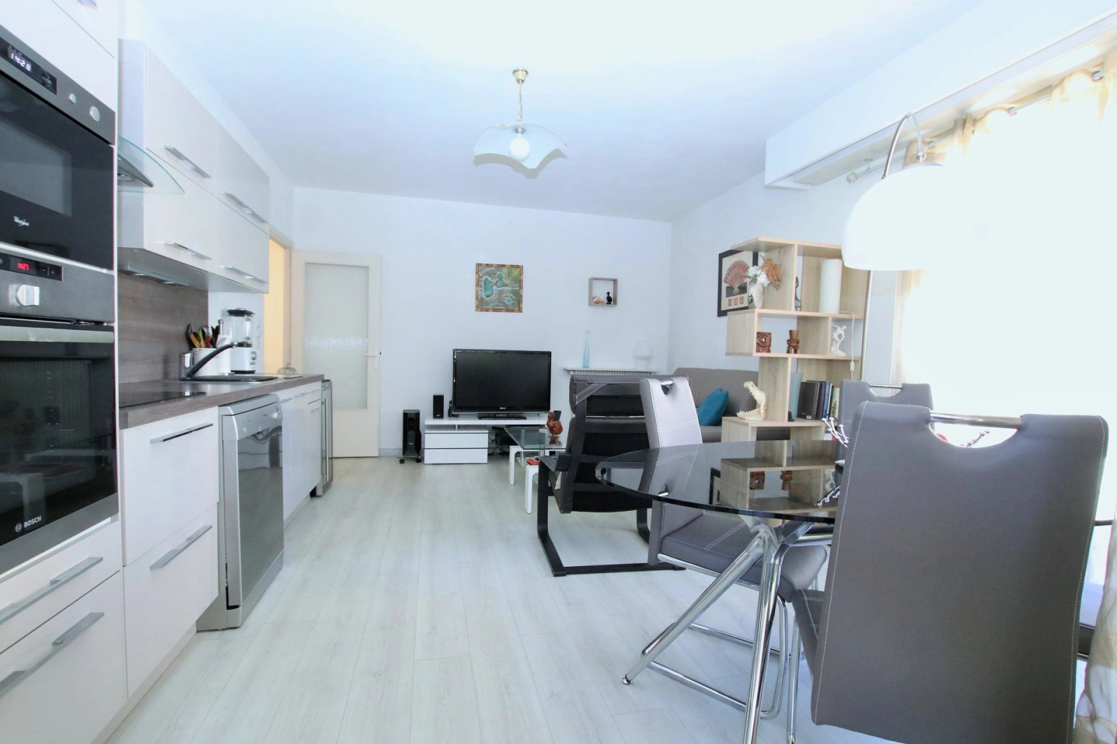 pièces d'angle de 63.55 m² bénéficiant d'une terrasse de 14 m², entrée avec rangements, wc séparé, salle de bains, deux chambres et séjour avec cuisine américaine. Cave. Possibilité garage en sus.