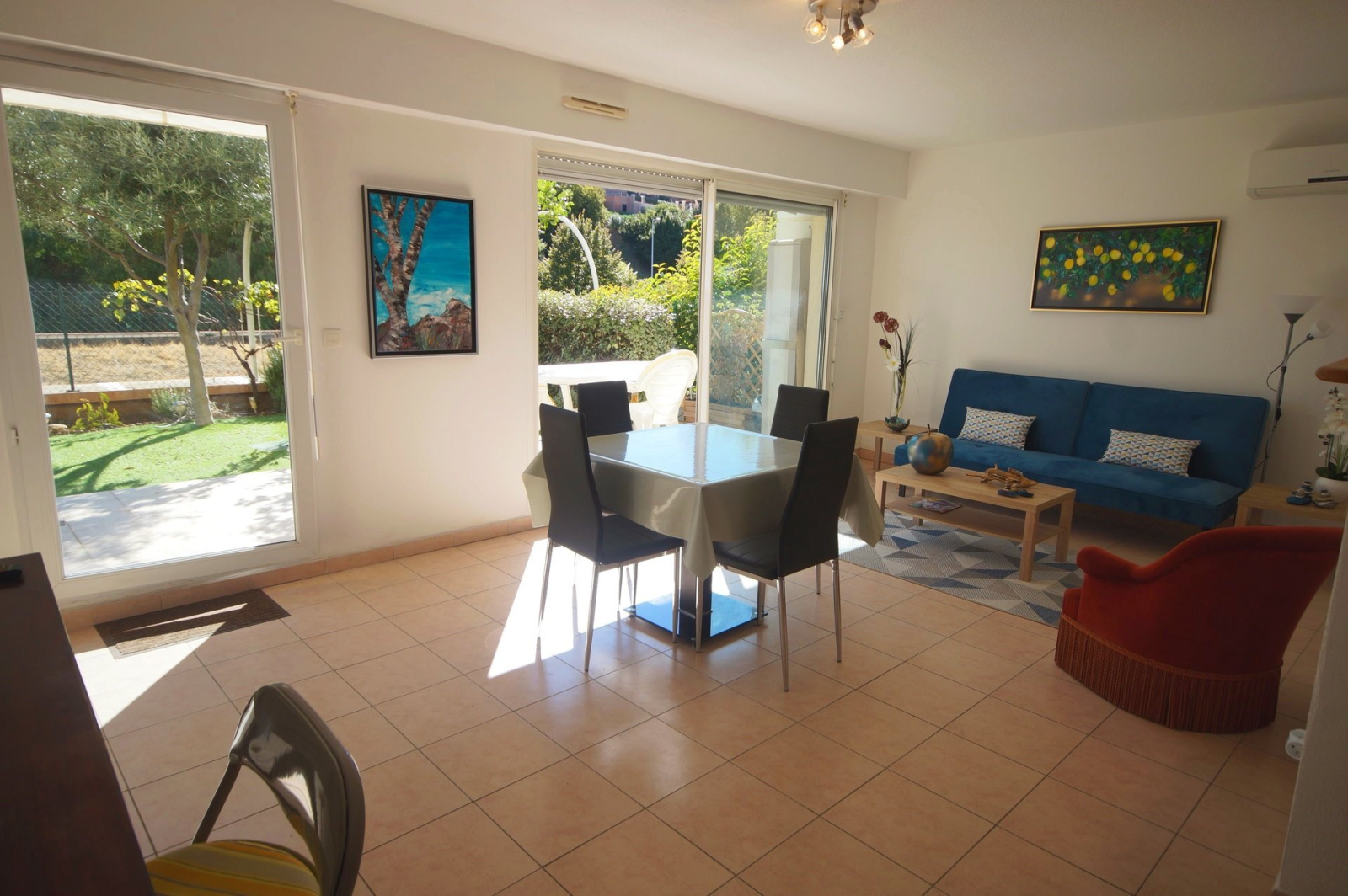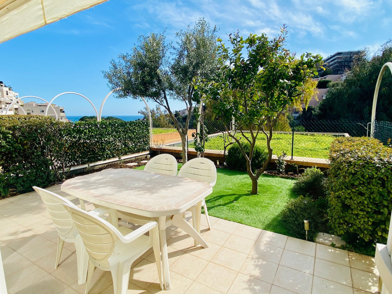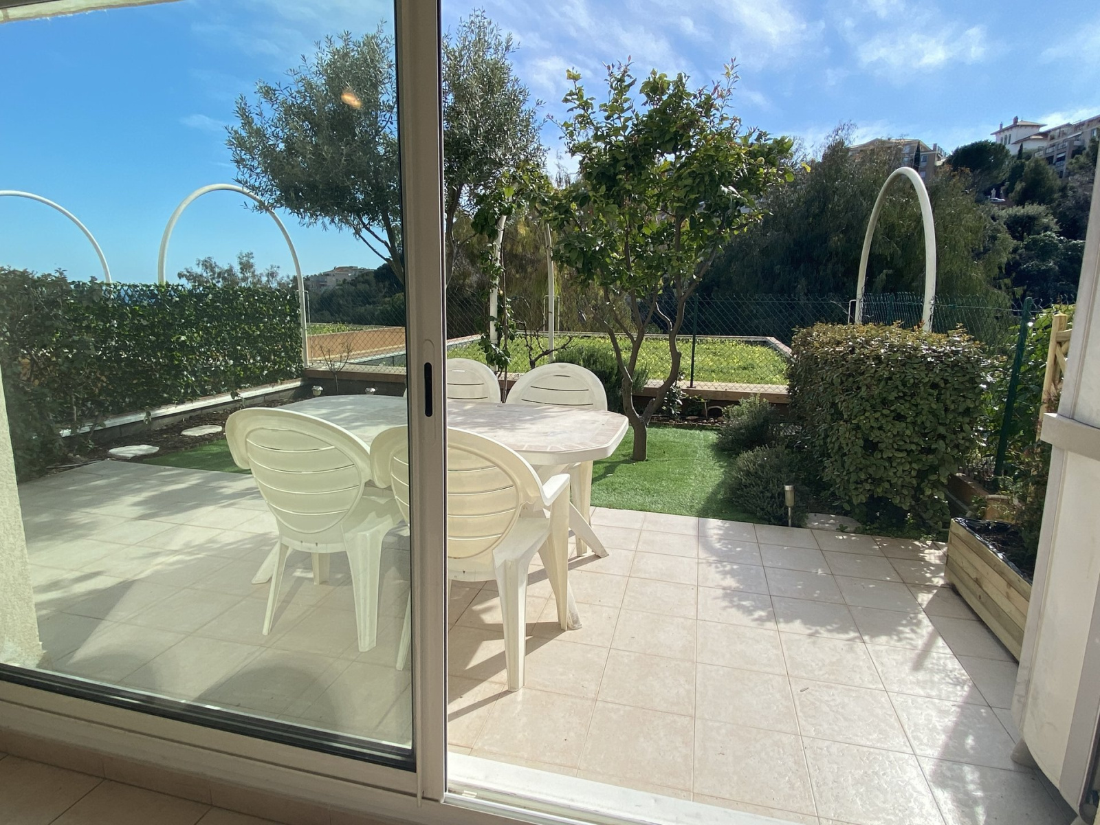 Nous vous proposons cet appartement trois pièces en rez-de-jardin surélevé composé d'une entrée, un grand séjour lumineux avec sa grande baie vitrée donnant sur terrasse et jardin de 44m2 expo SUD OUEST avec aperçu mer, une cuisine us aménagée et équipée, deux chambres avec placards au calme, une salle de douche, un wc indépendant.