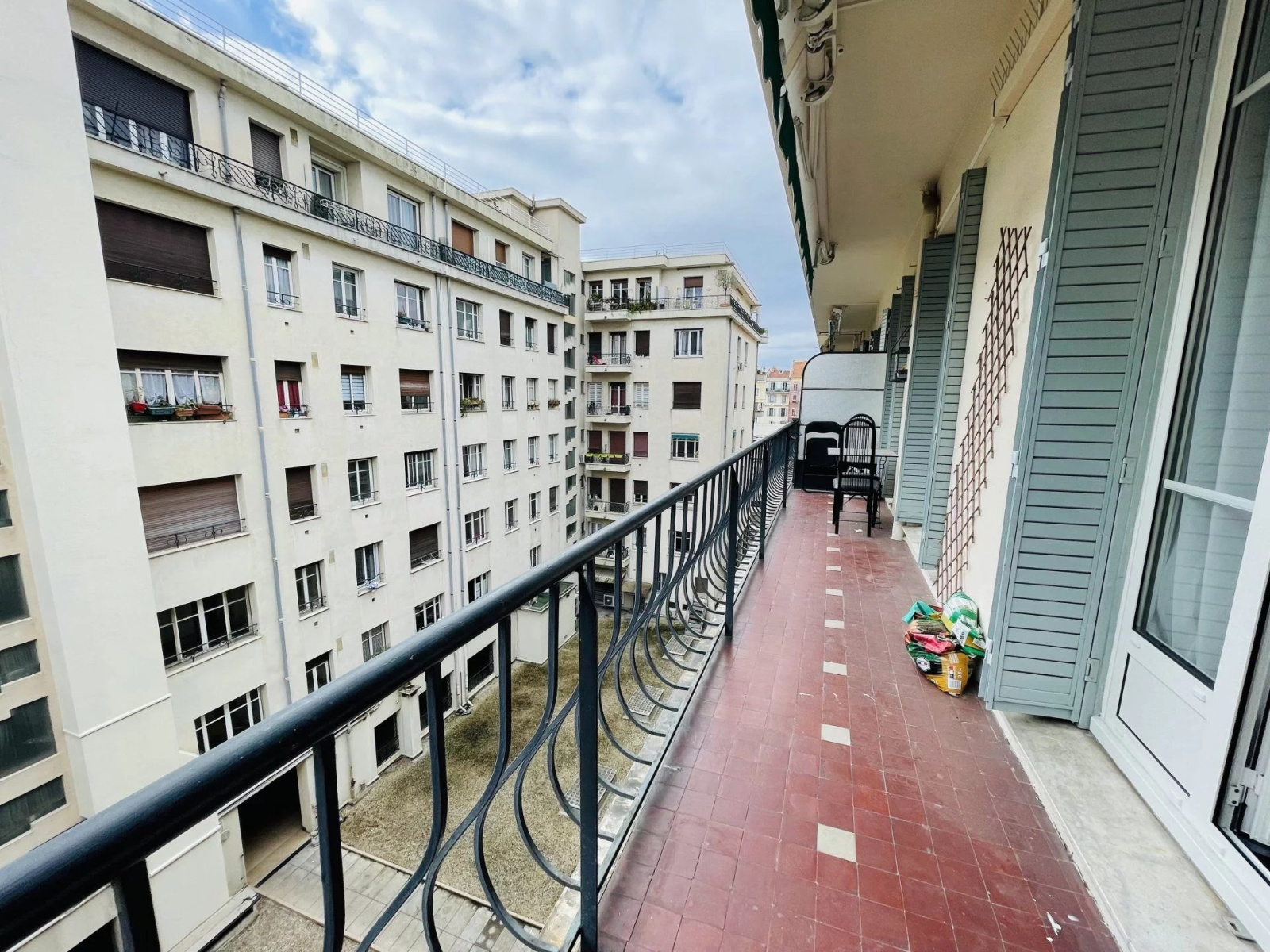 Nice centre, au calme absolu, en étage élevé, appartement 3 pièces de 92 m² avec balcon au sud, entrée avec placards, deux chambres, vaste séjour, cuisine indépendante, salle de douche et wc indépendant. Double vitrage et climatisation réversible. Idéalement situé rue Hôtel des Postes.