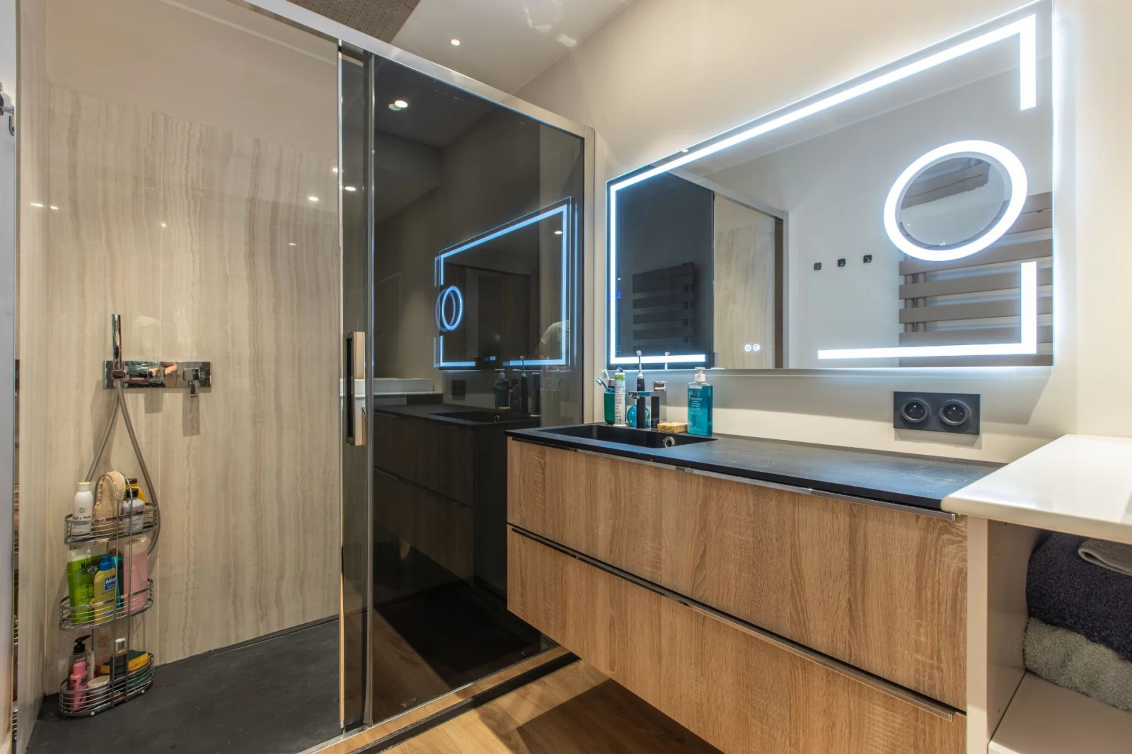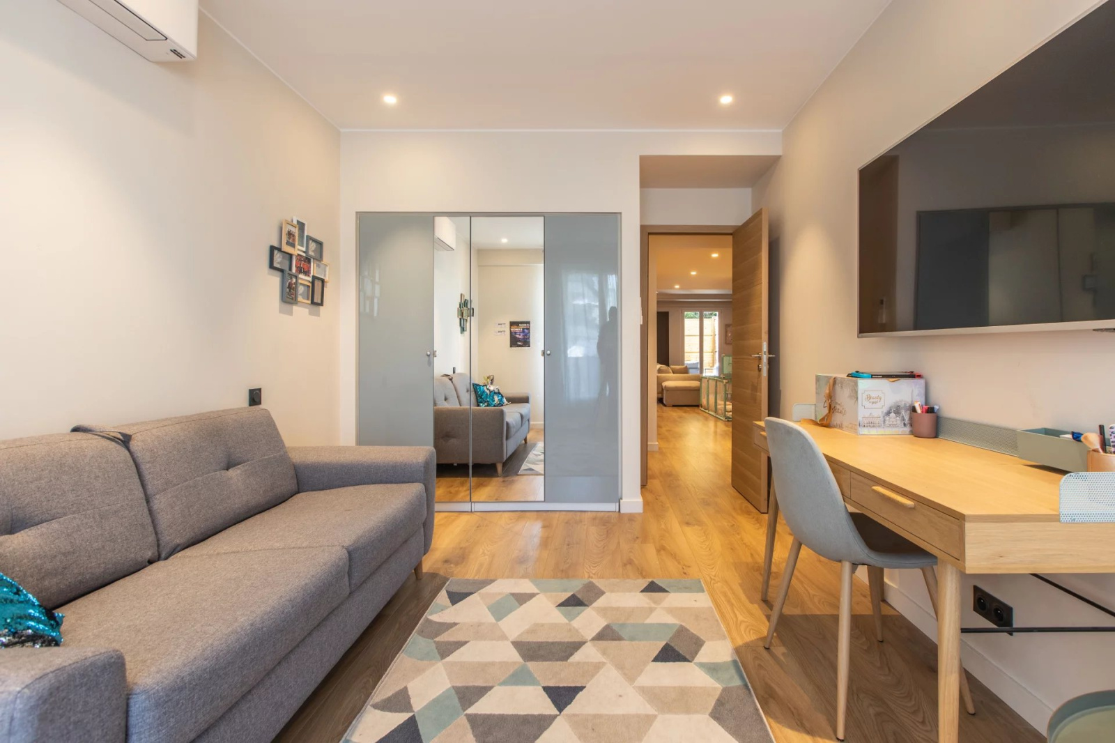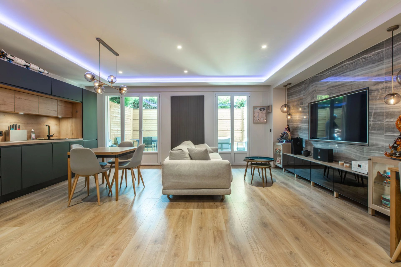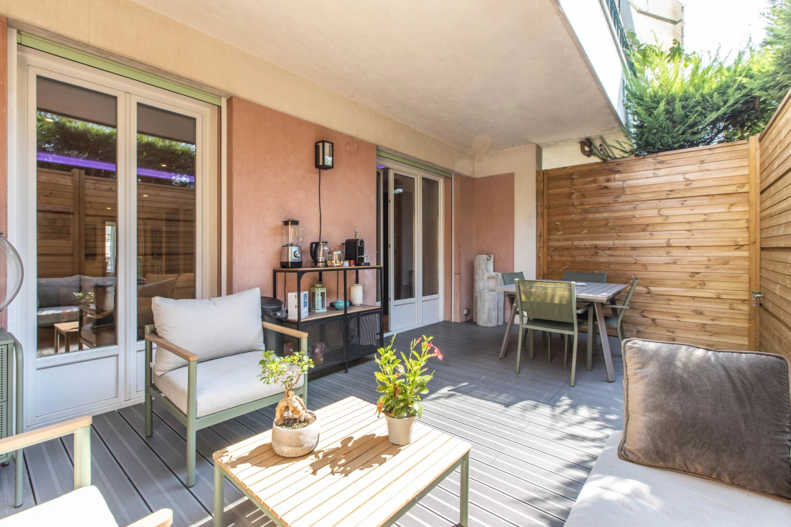 Appartement 3 pièces de 77.30m² entièrement rénové, en rez-de-chaussée, composé d'une entrée avec plusieurs rangements, d'un séjour avec cuisine américaine donnant sur une grande terrasse exposé Sud, de deux chambres donnant sur un balcon exposé Nord, d'une salle de douche et d'un WC indépendant. Une cave vient compléter ce bien.