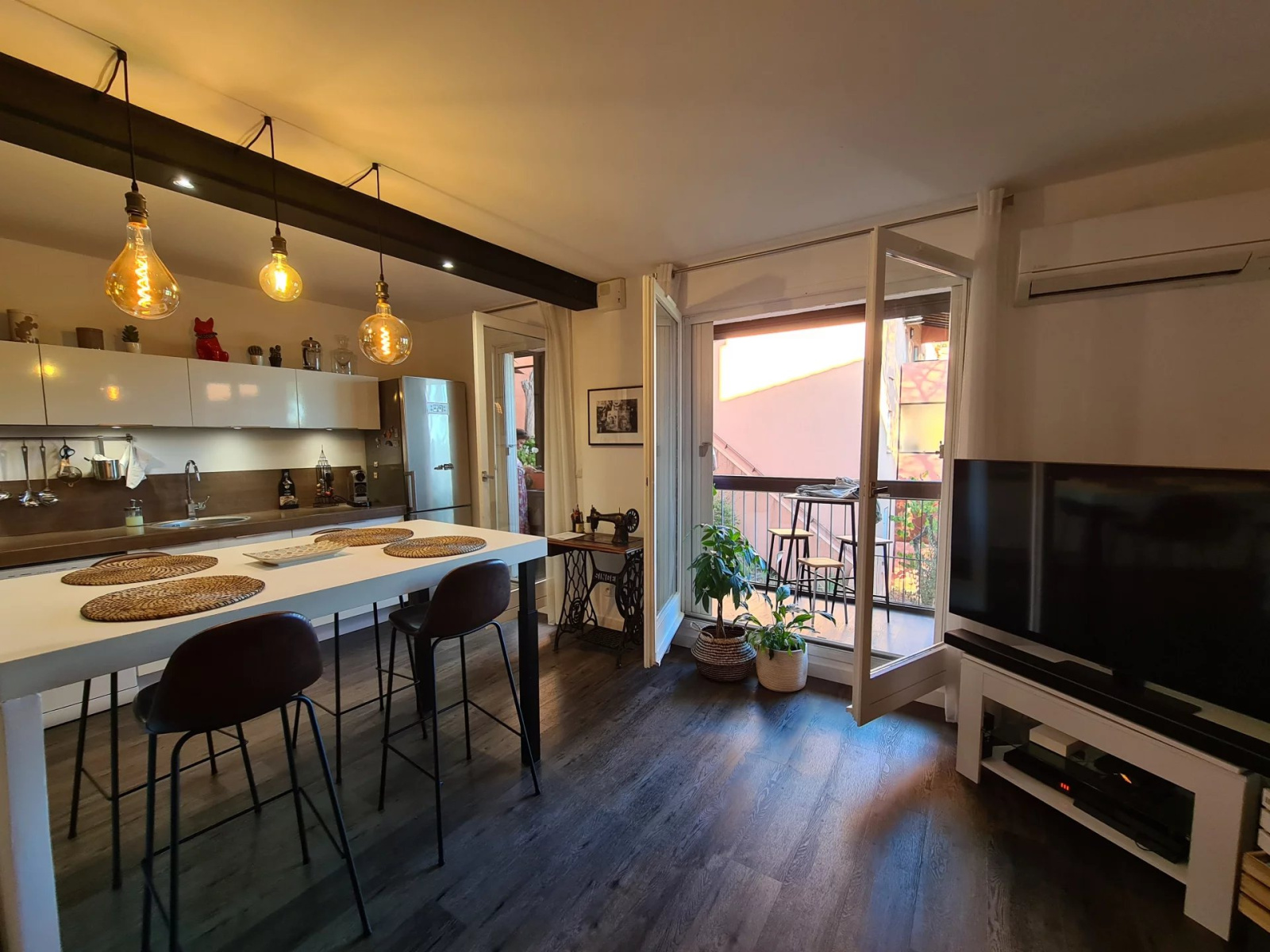 - Ce trois pièces entièrement refait à neuf avec goût, climatisé, d'environ 63m² au 2ème étage, est composé d'une entrée, d'une superbe pièce de vie de près de 32m² comprenant une grande cuisine entièrement équipée avec îlot central et d'un salon ultra cosy, donnant sur une spacieuse Loggia de 18m².