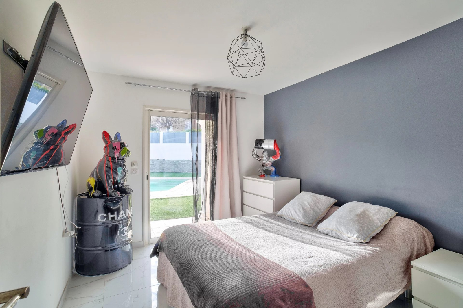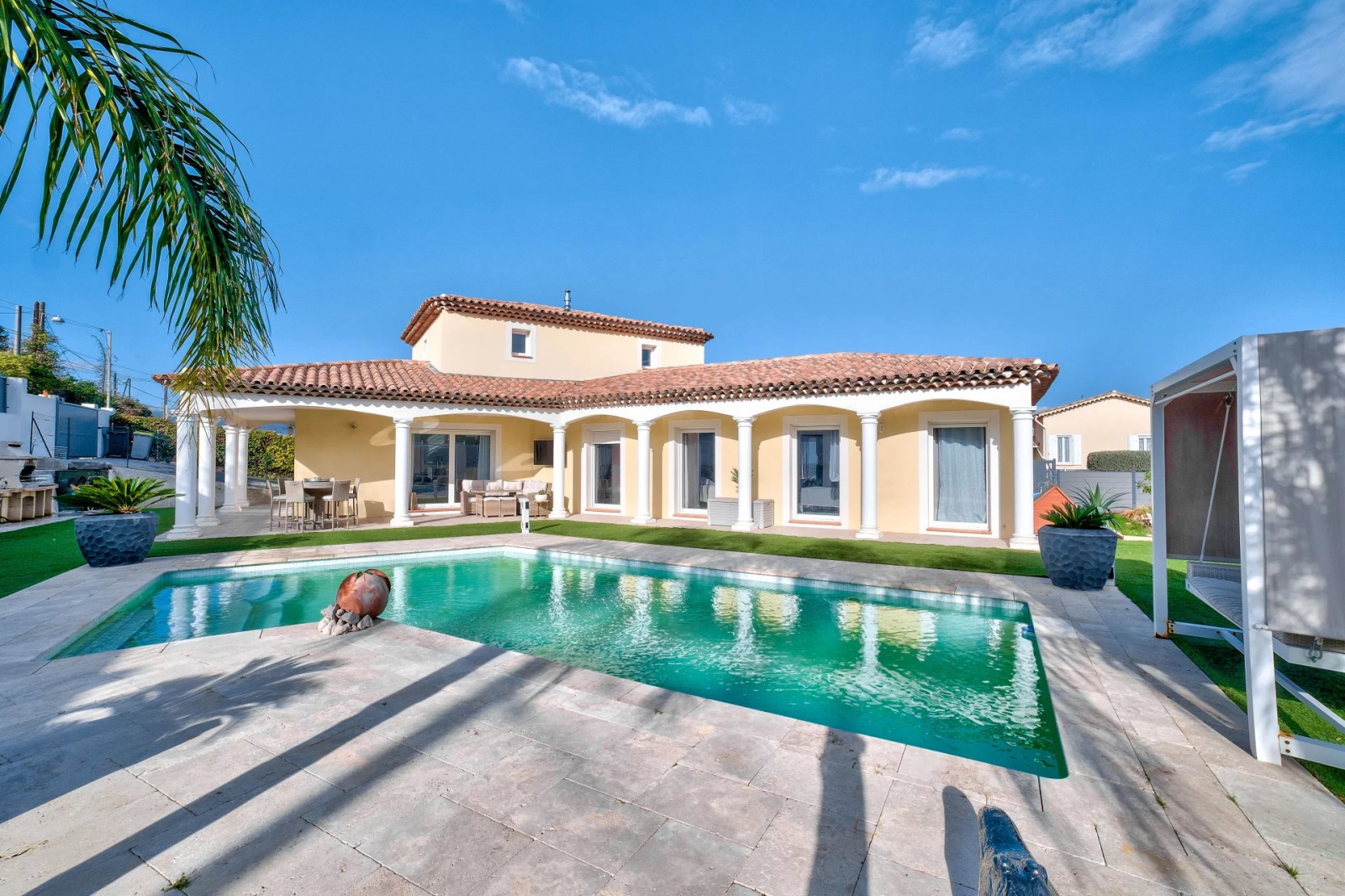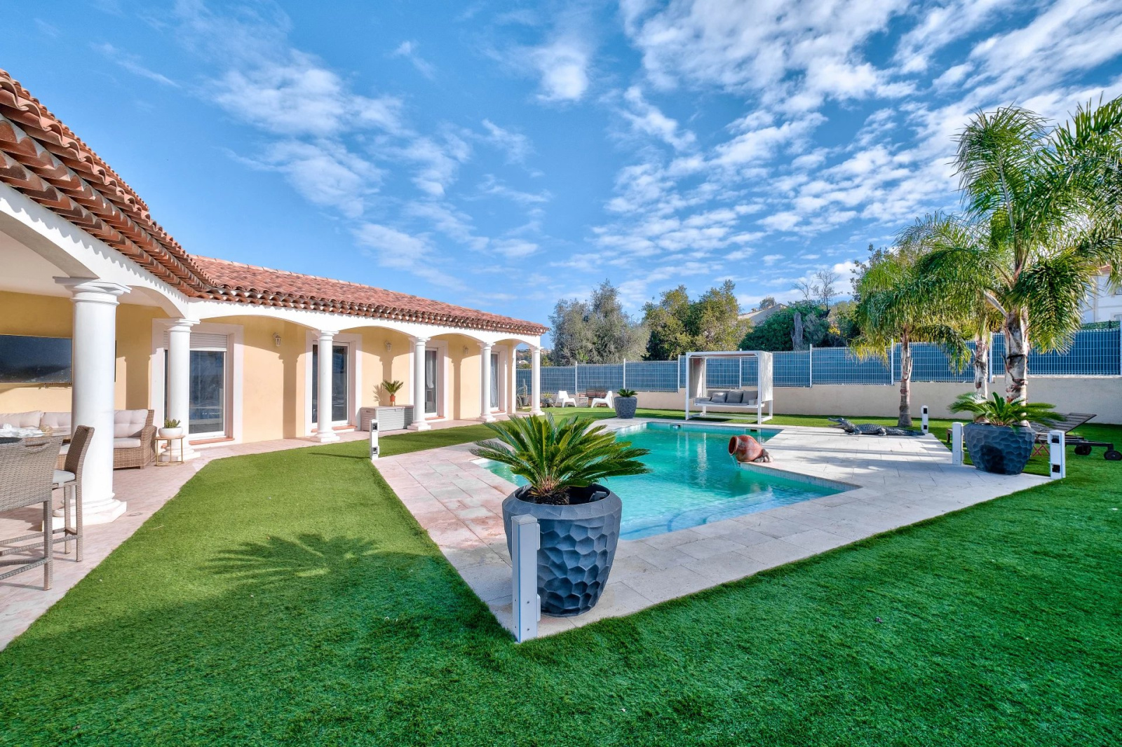 Cette villa est entièrement domotisée, équipée de volets roulants électriques, d'un chauffage au sol, d'ouvertures à galandage, d'une aspiration centralisée, le jardin est facile d'entretien car recouvert d'une pelouse synthétique.