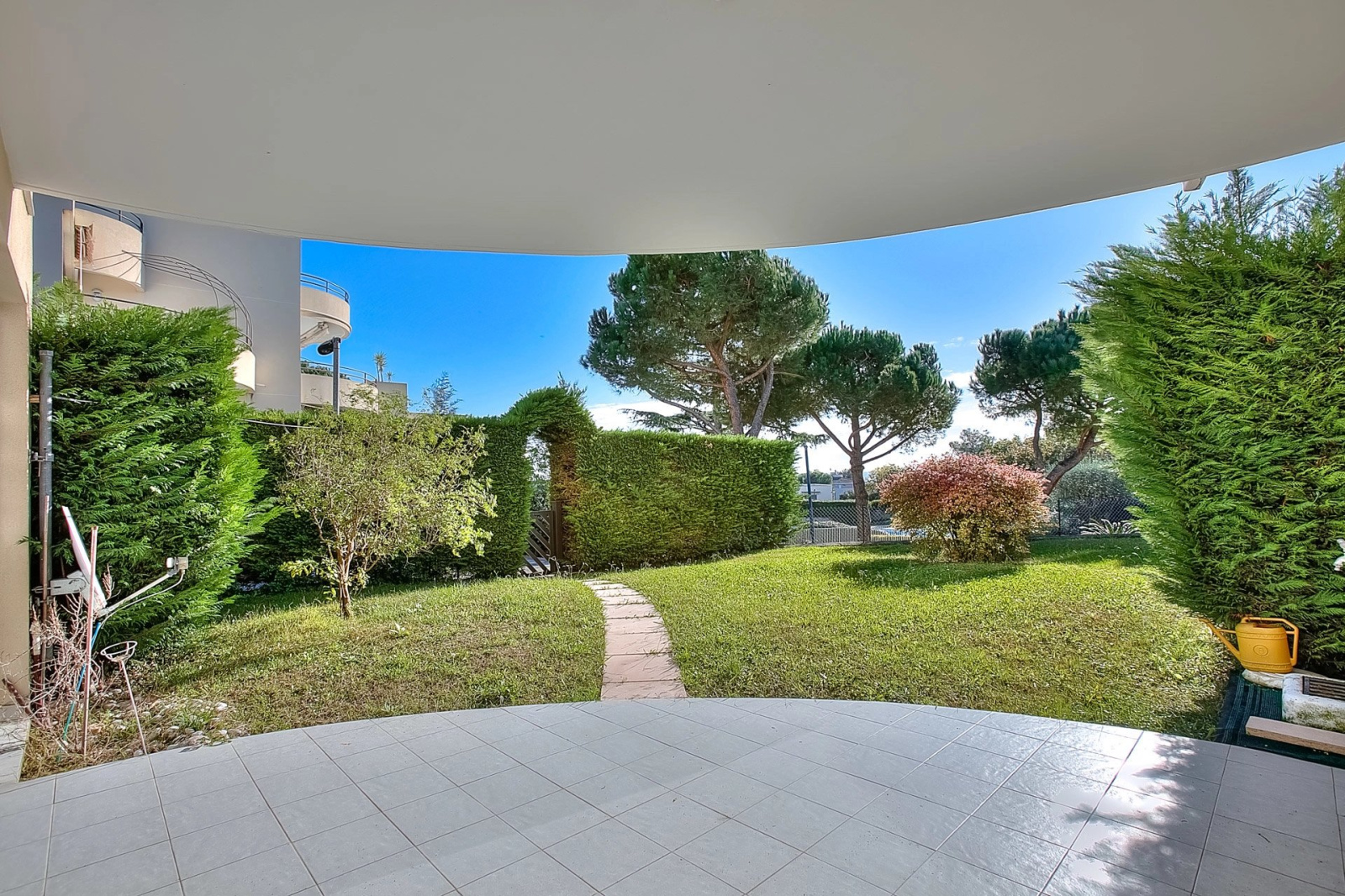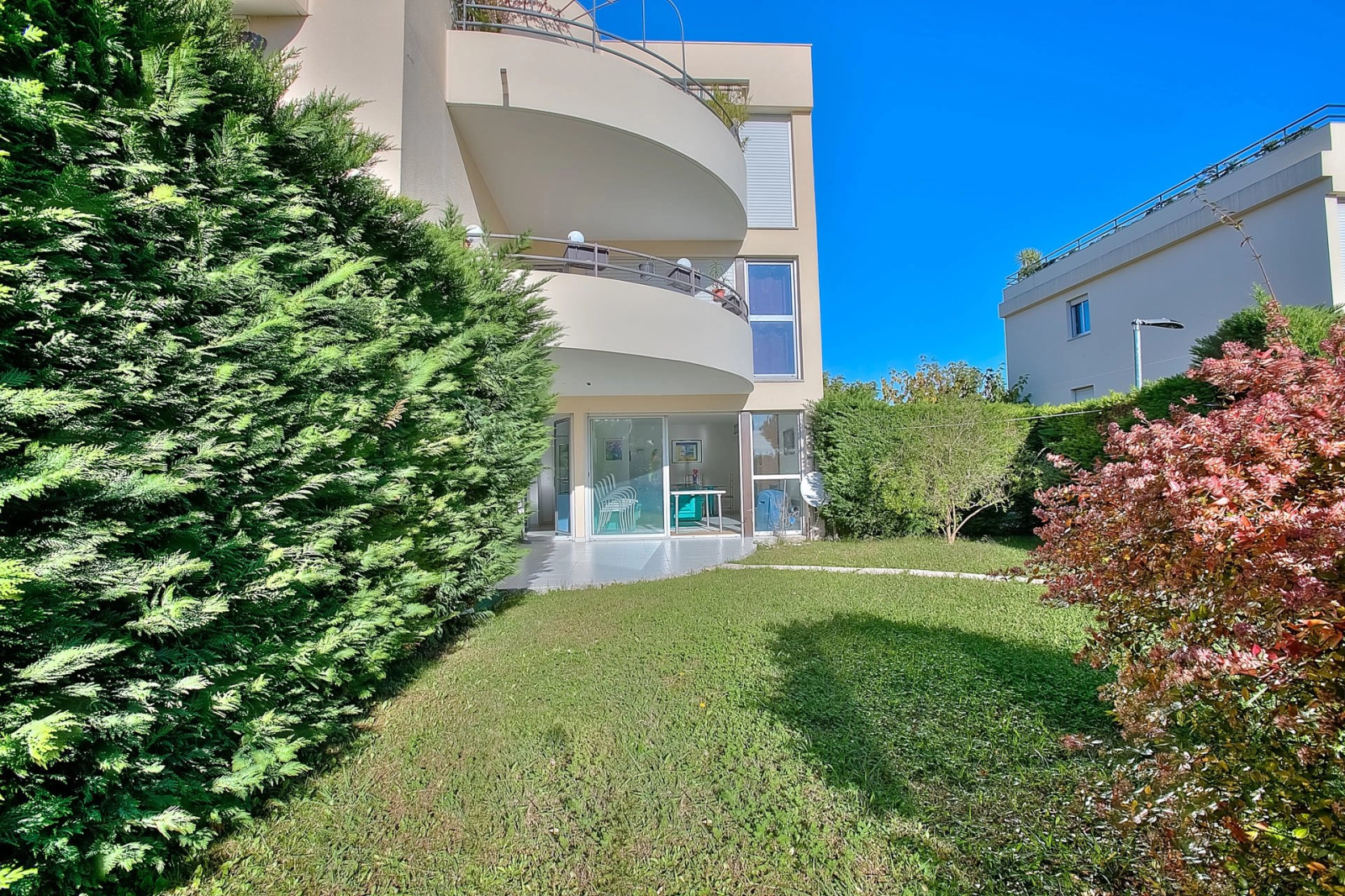 Villeneuve Loubet proche mer, Dans un parc verdoyant avec piscine, beau 3 pièces de 67,27 M2 avec jardin plat d'environ 90 M2 plus 2 belles terrasses. L'appartement traversant se compose comme suit: Entrée, salon, 2 chambres avec chacune sa sdb, cuisine indépendante.